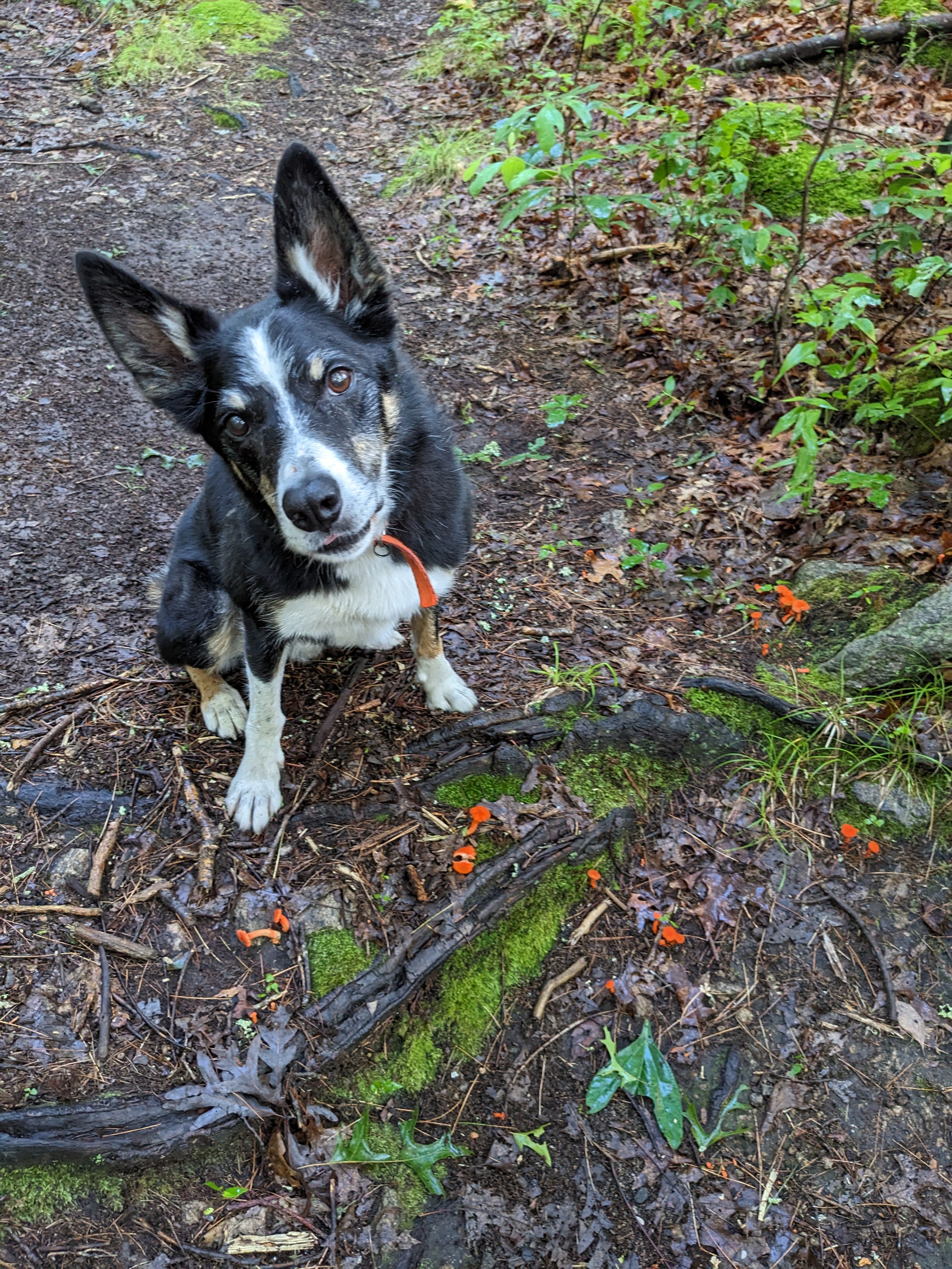 My most recent dog, Tock, has been difficult in ways I’d never experienced before. He gets easily frustrated whenever he feels that something isn’t going the way he expected. For example, he’s a great trail dog who never gets far away and always waits for me at junctions, but if I turn the “wrong” way (i.e., a direction we don’t usually go), he vents his frustration by leaping up on me while uttering a little growl. Chastising him doesn’t prevent it. He’s quite certain he’s right.