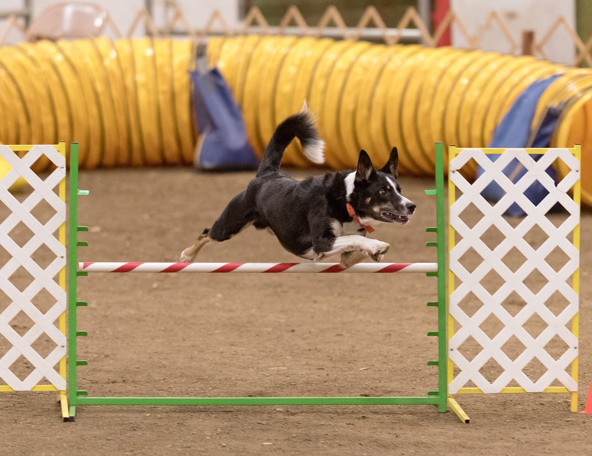 What could I do? Well, I reasoned that if I could only get to the leash stand first, I’d be able to direct all his excess excitement into our game of leash tug. To give myself a little more time, I started directing him over the final jump a second time (fortunately, there’s no penalty for re-taking the final obstacle). While Tock was busy circling the jump and re-jumping it, I would race ahead, grab the leash, and hold it out to him by the time he caught up to me. He didn’t waste any time grabbing it and engaging in a vigorous game of tug. We had our solution!