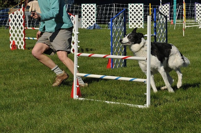 Naturally, this canine affinity to words is super exciting to someone who writes. I can spend enjoyable day upon day searching for the perfect words for my stories … and I like to give my dog that opportunity, too. In agility training, I invest a lot of time in deciding which words to use for commands—for my students’ dogs as well as my own. Our time running a competition agility course is short—from thirty to sixty seconds, usually—so we don’t want to blather on, using three words when one will do, or hollering out a word that’s difficult to enunciate or one that could be confused with other commands we’re also using. We need the right word for each situation, telling the dog exactly which obstacle to take, how to take it, or where to run.